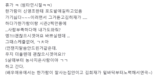 뜬금없지만 희재가람 동갑AU의 묘미는 이런 말 안듣는 싸가지바가지 어느면으로는 바보 라고 할 수도 있는 김희재를 착한감자 그리고마찬가지로 바보인 가람이와 붙여놓을 수 있다는 것이 아닐까하는 생각이 갑자기 ... 휴